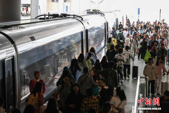 10月1日,搭客正在贵阳北站月台上、停车。当日是2025年邦庆中春假日第1天,贵阳北站启队伍车506趟,改革启站今后单日启队伍车趟数记录,迎去客淌顶峰。中新社记者 瞿宏伦 摄