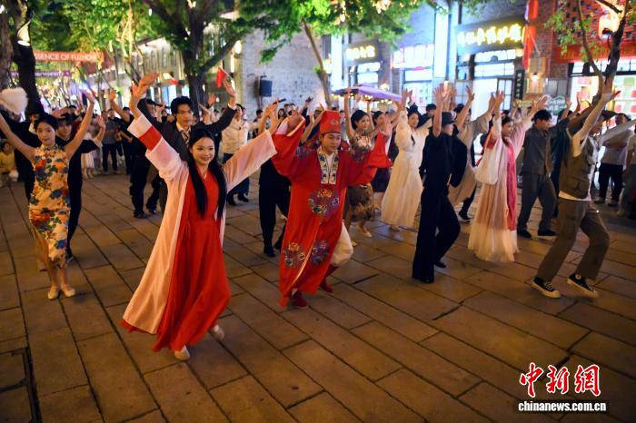 9月30日早,祸修祸州,演职职员巡街上演。中新社记者 王东亮 摄