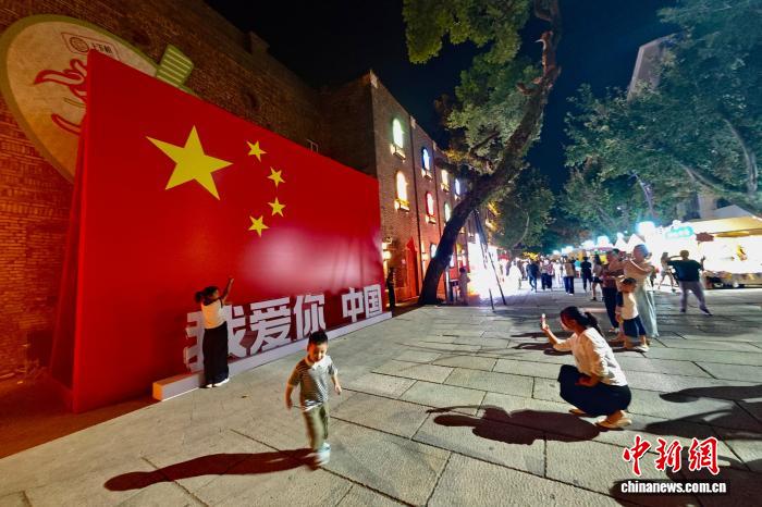 9月30日早,祸修祸州,公众旁观光影秀。中新社记者 王东亮 摄