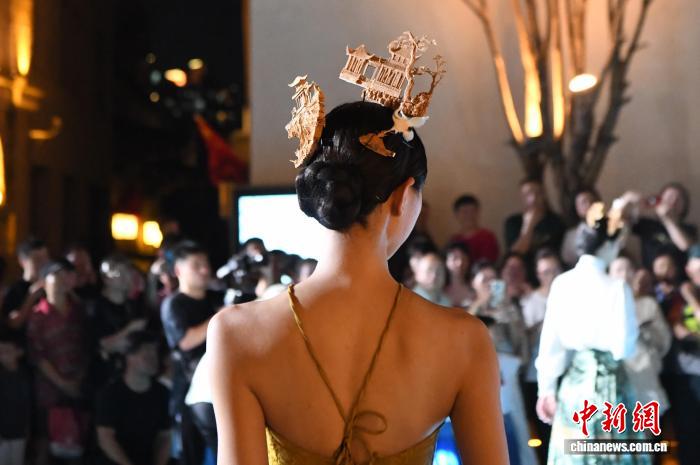 9月30日早,祸修祸州,模特头戴硬木绘头饰走秀。中新社记者 王东亮 摄