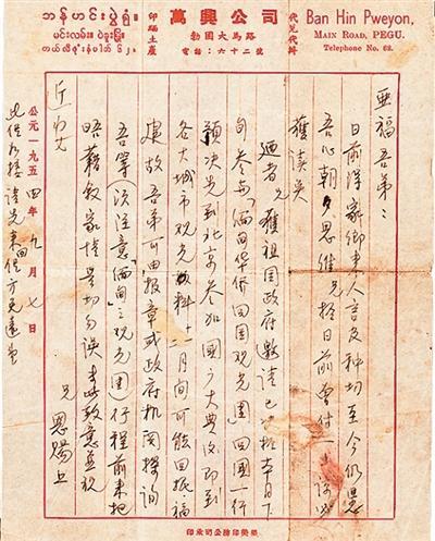 当前得故里去人行及种切,于今还是吾心晨夕念,维兄于当前曾付1书,谅必获读矣。 廼者兄获故国当局聘请,已绝于原月停旬到场“缅甸华裔归邦不雅光团”归邦1止,预绝先到北京参与邦庆年夜典,后便到各年夜乡市不雅光,料11两月间大概归抵祸修,故吾弟可由报章或者当局构造探听吾等(须注重“缅甸”之不雅光团)路程,前去把晤,藉道家情,是切勿误。 ——戴选自1954年9月7日祸修泉州籍缅甸华裔李赏赐写给弟弟的乡信 (祸修省泉州华裔汗青专物馆供应)